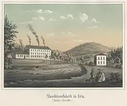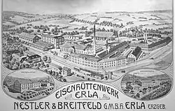 On 7 August 1650, the widower, Rosina Rüdiger, sold the debt-ridden hammer mill to Schwarzenberg town judge, Friedrich Röhling and her son, Hans Rüdiger. It was quickly rebuilt after its destruction in the Thirty Years' War, but destroyed again in August 1661 by a great flood. In 1806, mining commissioner (Bergkommissionsrat), Karl Heinrich Nitzsche from Obermittweida, bought the mill from the Reinhold brothers. He employed hammersmiths, hammer boys, carpenters and charcoal burners in two workshops. In 1836 the mill went into the hands of Carl Gotthilf Nestler from Wittigsthal and his son-in-law, Eduard Wilhelm Breitfeld, from Rothenhammer-Unterwiesenthal. The firm of Nestler & Breitfeld, which also owned the Siegelhof in Pöhla and the Arnoldshammer in Rittersgrün, thus expanded their holdings and, under its ownership, the hammer mill in Erla boomed. Around 1840, a steel rolling mill was added and the latest iron ore extraction techniques were introduced. Nestler & Breitfeld had an engineering works added by 1843, run by the Englishman, John Payne. From 1850, more buildings were erected and old facilities had to be renovated. Before a great fire in 1870 the Erla Hammer Mill consisted of 27 individual buildings, of which many were totally destroyed by the fire. By 1879, the most important parts of the ironworks had been rebuilt and even new residential quarters were built. But the furnaces were not reactivated; pig iron for the manufacture of ironmongery was now brought in from Westphalia and Silesia. The products from the factories in Erla were now iron and steel castings, machines, household tableware and black plate.[2] The construction of the Johanngeorgenstadt–Schwarzenberg railway by the Royal Saxon State Railways in 1883, which included the Erla Halt (Haltestelle Erla), facilitated the delivery of raw materials and dispatch of its end products. The factory owners had now specialised in machines for the paper industry. At the top was the die Nestler & Breitfeld GmbH. This later became an Aktiengesellschaft or joint stock company. In 1928, its majority shareholders became Jørgen Skafte Rasmussen, owner of the Zschopau Motor Works (DKW). During the Great Depression and a flood in 1931 iron production came to a stand still. At Nestler & Breitfeld, the parts for DKW engines were produced.