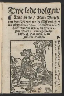 The ballad was originally printed as a broadside titled Van Dirick van dem Berne (concerning Dietrich von Bern) in 1535/45[2] or 1560[3] together with another ballad Juncker Baltzer in Lübeck, and was printed again in a Low German songbook from 1590 or 1600. The broadside is heavily corrupted—possibly the work of a printer famous for his mistakes, Johannes Balhorn the Elder—and not always comprehensible.[2] Victor Millet suggests that it was printed in honor of King Christian II of Denmark, who returned from exile in the Netherlands at this time.[4] Elisabeth Lienert finds this interpretation questionable, however notes that Juncker Baltzer, the text printed alongside Ermenrichs Tod, is clearly about Christian.[5]
