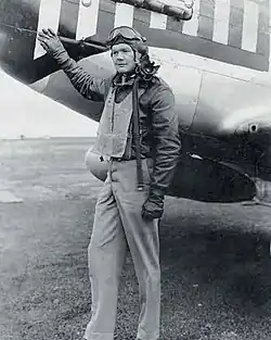 After completing P-38 Lightning training, he was assigned to the 79th and then the 77th Fighter Squadron of the 20th Fighter Group in the European Theater of Operations, in January 1944. Flying missions from RAF Kings Cliffe, he was promoted to first lieutenant in May 1944. He was credited with a shared aerial victory of a Focke-Wulf Fw 190 over Reims, France on July 14, 1944.[5]