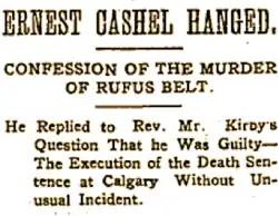 Ernest Cashel was hanged on February 2, 1904, at the North-West Mounted Police barracks in Calgary.[8] He was buried in an unmarked grave, in the potter's field section of Calgary's Union Cemetery.[9]