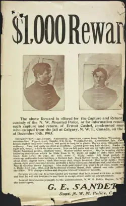 Cashel was born in Nebraska in 1882.[2] When he was 14 he left home and quickly ran afoul of the law. He was arrested and sent to jail twice; both times he escaped. Now a fugitive in the United States, he crossed from Wyoming, through Montana into Alberta, Canada, and worked as a ranch hand at several locations. On October 14, 1902, he was arrested and charged with forgery for passing a bad check.[3] While being transported by train under guard, Cashel escaped out the window of the train's lavatory.[4] A posse was formed by the North-West Mounted Police, but Cashel eluded them.
