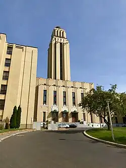 Another important example of Cormier's work can be found on another Quebec university campus, the Casault pavilion of Université Laval (named after the first rector of the university), familiarly known by students as the 'Louis-Jacques'. The design was originally started by the Benedictine architect monk Dom Bellot but completed by Cormier after Dom Bellot's death. Plans were laid out in 1948 but only completed in 1960, it is a massive cathedral-like building, originally designed as Quebec City's Grand Séminaire, which is particularly spectacular viewed from a distance along the impressive mall that runs along the east–west axis of the campus grounds.[3] Despite an unfortunate renovation scheme in the 1970s, which gutted the chapel, filled in the magnificent enclosed courtyard and transformed the interior into an undecipherable labyrinth, the building has become the most recognized landmark of the second-oldest university in North America and home to Laval's faculties of Music and Communications, as well as to Quebec's National Archives (in the former church).