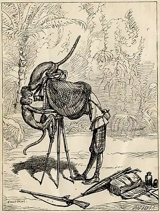 Many examples of Griset's work are now in the collections of the Victoria and Albert Museum.[5] Less well known are the prehistoric hunting scenes specially commissioned by Sir John Lubbock, some of which are in Bromley Museum, and which were a ground-breaking and sympathetic treatment of the subject.[6] Some of his comic work appeared in Punch, where he was briefly on the staff between 1867-9, as well as in its competitor, Fun. He left Punch at the age of twenty four and worked on illustrating Aesop’s Fables (1869).[7][8] Of this work a reviewer noted that "nothing so quaint as these illustrations has appeared since the days of Grandville…Griset possesses the faculty of investing his animals with human expression, without ever causing them to lose their own identity, and of making them funny without being ridiculous."[9]