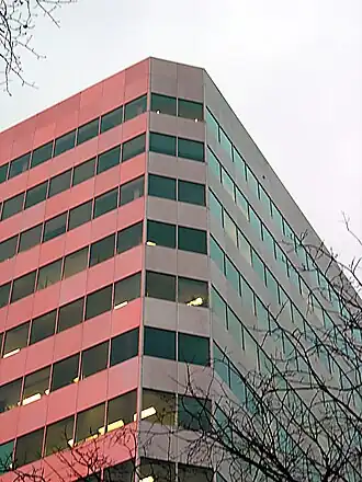 Throughout the 1960s, the City of Winnipeg conducted transport studies which led to a rethinking of traffic flow through Portage Avenue and Main Street, the city's hub, and had Smith Carter conduct the transit forecast studies which concluded that mixing pedestrian and vehicular traffic would no longer be viable, ultimately leading to the construction of an underground concourse replacing the four sidewalks of the corner.[19] Significant or large scale works during this period include the Canadian Wheat Board and Grain Commission buildings (1962 and 1970, respectively), the Royal Bank of Canada and Bank of Canada buildings (1965 and 1971), the Pan Am Pool (1967), and the Manitoba Centennial Centre (1967–1972).[note 2] One of the firm's most identifiable works from the period, and "one of the most identifiable landmarks of the city" is the Richardson Building[9] (1967–1969; with Skidmore, Owings and Merrill as consulting architects),[20] It forms the anchor of the Lombard Place development, which includes the Winnipeg Inn (1970, currently the Fairmont Hotel) and the underground concourse later connected to Trizec's Winnipeg Square shopping mall (1979)[20] and the Commodity Exchange Tower (1974–1979, often referred to as the "Trizec Building" locally).[21] Other large scale projects included the Woodsworth Building on Broadway (1973), The Great-West Life Assurance Company (1983), and the Air Canada building (1985).[6]
