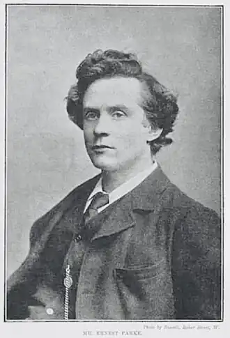 He was born in Stratford-upon-Avon in 1860, the youngest of four sons of Anne née Hall (1824–1902) and Fenning Plowman Parke (1826–1902), an Excise Officer.[2] On leaving King Edward VI School he worked in a bank in Stratford-upon-Avon until 1882. Having started to contribute pieces on local topics to the local newspapers, he took up a position as a journalist on the Birmingham Gazette, followed soon after by The Midland Echo in Birmingham, later becoming an assistant sub-editor on that paper. He was editor of the financial newspaper Stock Exchange on Fleet Street, but not liking the work in 1884 he joined the staff of the Fleet Street evening paper The Echo.[2] In the same year he married Sarah Elizabeth Blain (1863-1937). Herself a journalist, she after wrote under the pen name 'Mrs. Ernest Parke'. On the marriage certificate his occupation was recorded as 'Journalist'.[4] Their sons were: Fenning Matthew Parke (1885-1928) and Hall Parke (1905-1985).[5]