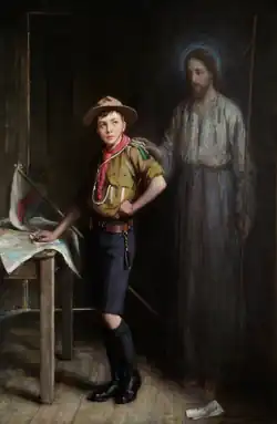 Soon after the launch of Robert Baden-Powell's Boy Scout scheme in 1908, Carlos founded the 107th London Scout Troop, now the 21st Camberwell (Trinity) Scout Group.[1] He painted a number of pictures of Scouts between 1910 and 1915, which helped to bring the ethos of Scouting to a wider public.[4] Titles included A Ripping Yarn (1910), If I Were a Boy Again (1911) and Good Service Work in a London Slum (1913).[5] Perhaps the best known is The Pathfinder (1913) which shows a young Scout with the hand of Jesus Christ on his shoulder. It was widely circulated as a print, and a copy has featured on the set of the television soap opera, Coronation Street since 1961.[6] One of two original versions of The Pathfinder, together with a number of Carlos's other Scouting works, are held at Gilwell Park in Essex, the headquarters of The Scout Association.[1]