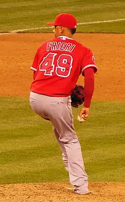 On May 3, 2012, the Padres traded Frieri to the Los Angeles Angels of Anaheim for second baseman Alexi Amarista and minor league pitcher Donn Roach.[5] Frieri earned his first career save on May 23, 2012 against the Oakland Athletics. On September 25, 2012, Frieri was one of five pitchers (Zack Greinke, Garrett Richards, Scott Downs, Kevin Jepsen) to combine for 20 strikeouts in a nine-inning game, tying a Major League Baseball record. For the season, Frieri notched 23 saves while striking out 80 batters in 54.1 innings for the Angels.