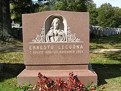 In 1960, unhappy with Castro's new régime, Lecuona moved to Tampa, Florida and lived on West Orient Street in West Tampa with his relative, singer Esperanza Chediak. Lecuona lived his final years in the US. While traveling in the Canary Islands he died of a heart attack on November 29, 1963, in the town of Santa Cruz de Tenerife, where he had gone to recuperate from a lung ailment.[2] He was interred at Gate of Heaven Cemetery in Hawthorne, New York, but his will instructed that his remains be repatriated after the Cuban régime changes. A great deal of Lecuona's music was first introduced to mass American audiences by Desi Arnaz, a fellow Cuban and Lucille Ball's spouse.