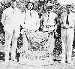 ![]() Jury (second from right) as skip of the Karangahake four that won the fours title at the 1919 New Zealand national lawn bowls championships | |||||||||||||||