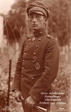 He scored one last victory, after a year's break, on 24 July 1917.[6] However, four days before, at the Red Baron's request, he had relinquished command of Jagdstaffel 10 to Werner Voss. Althaus's failing eyesight caused his removal from command and combat;[7] he also seems to have been regarded as a scandalous gambler.[8] He shifted to command of Jastaschule II, but that assignment was also ended by his diminishing vision. In a reversal of the usual system of transfers, Althaus shifted back into the command of an infantry company at Verdun. After a battle in which his company was reduced to fifteen men, he was captured by the American Army on 15 October 1918. He was repatriated in September 1919.[1]