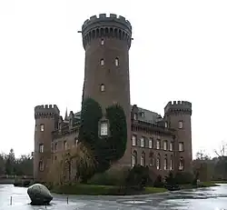 Zwirner's best building is probably the church of St. Apollinaris at Remagen,[3] to which, however, the same objection of monotony of plan has been made. He also built a church at Mülheim on the Rhine, and one at Elberfeld. He restored the castle of Argenfels on the Rhine, built the castle of Herdringen in the style of the ancient fortress castles on the Rhine for Count von Fürstenberg, and also the Moyland Castle near Cleves. He designed a mausoleum for the family of Count Ernst Zur Lippe-Biesterfeld on the grounds of the Klosterruine Heisterbach near Königswinter, and built the Rathaus (Town Hall) in Kolberg, Pomerania.[4] His last work was the magnificent, 1861 Moorish Revival Glockengasse Synagogue at Cologne. He died at Cologne in 1861. He is buried in the Melaten-Friedhof.[2]