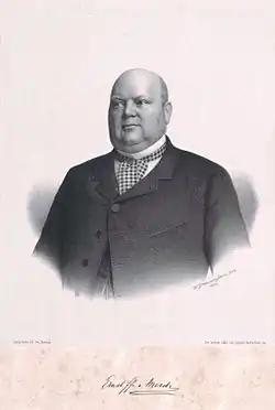 In 1853, Merck was appointed Austrian Consul General in Hamburg. He invested at that time in the railway lines of Austria and in 1856 co-founded and joined the board of the Empress Elisabeth Railway, named after the Empress of Austria. Thanks to his work, he was raised in 1860 by Emperor Franz Joseph to the rank of baron in the hereditary Austrian nobility. This was not positively received by the citizens of Hamburg, which was a republic. Even his half-brother, Syndicus Carl Merck (1809-1880) took occasion to complain that recently Hanseatic citizens "hunted for Orders and nobility and the other satisfactions for vanity."[1]