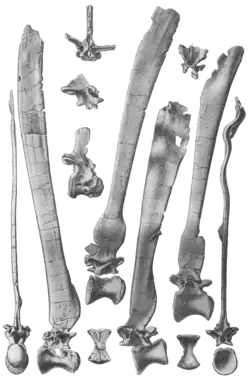 On January 18, Stromer unearthed three very large limb bones, the first dinosaur fossils discovered in Egypt, at the Bahariya Formation southwest of Cairo. He soon had to return to Germany, but his fossil collector Richard Markgraf discovered the partial skeleton of a new dinosaur from Bahariya in 1912 which he shipped to Stromer. The partial skeleton consisted of a lower jaw, teeth, and vertebrae that had dorsal spines. Stromer published his findings in the Abhandlungen (Discourse) of the Bavarian Academy of Sciences in 1915, naming the dinosaur Spinosaurus aegyptiacus.[2] Stromer theorised that Spinosaurus' spines formed a fatty hump akin to a bison.[3]