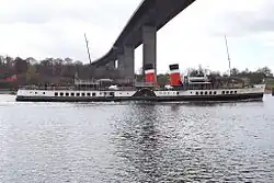 An oil rig called the Texaco Captain collided with the road deck on 4 August 1996 resulting in the closure of the bridge. The oil rig was constructed upstream at Clydebank before being towed down the River Clyde.[30] The bridge reopened to pedestrians and cyclists on 22 August 1996. This was followed by cars and motorcycles on 30 August 1996 and was opened again to all vehicles including heavy goods vehicles on 22 December 1996. Repairs to the bridge cost £3.6 million with a further £700,000 in lost revenue from tolls.[31]