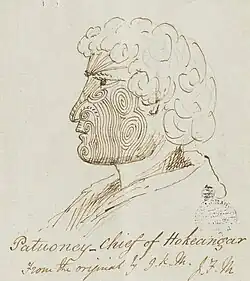 Patuone was thus born into the fighting aristocracy of the Ngāpuhi and from an early age was trained in both the arts of war and in the priesthood. He was famed for his skills and knowledge in both areas, becoming a trusted confidant of many in both the Māori and Pākehā worlds. In fulfilment of the predictions of seers who foretold the coming of the Pākehā, Patuone witnessed their arrival. His father Tapua was received on board the Endeavour by Captain James Cook on his visit to the Bay of Islands in 1770.[4] Potential enemies knew of the warrior reputation of the Tapua family.