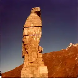 Officers of the mountain brigade considered to erect a cenotaph for the golden eagle, the symbol of the brigade, from stone tailings of the fortification Gondo. Baumann had good connections to the commanders of the brigade. Brigadier Hans Bühler was married to his second cousin, and he knew the colonel of the engineer corps, Werner Grimm, since his youth in Bern. Baumann got the job to explore the possibilities and his proposal of an over nine meter high monument made of the tailings pleased the two superiors. Baumann described his approach in the following way:[7]