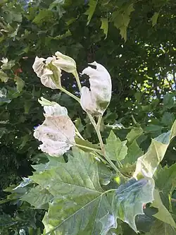 Erysiphe platani, also known as sycamore powdery mildew, is a fungus native to North America that now infects sycamore tree species worldwide.[2] Infections may spread rapidly in urban settings with large groups of young trees or in plant nurseries.[3] This mildew thrives when there are high humidity conditions during the growing season.[4]