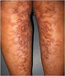 Erythema ab igne (Latin for 'redness from fire') EAI, also known as hot water bottle rash[2] or toasted skin syndrome,[3] is a skin condition caused by long-term exposure to heat (infrared radiation).[4] Prolonged thermal radiation exposure to the skin can lead to the development of reticulated erythema, hyperpigmentation, scaling, and telangiectasias in the affected area. Some people may complain of mild itchiness and a burning sensation, but often, unless a change in pigmentation is seen, it can go unnoticed.