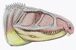 The heads of erythrosuchids are generally disproportionately large and deep. In all erythrosuchids, the lower margin of the premaxilla, the bone at the tip of the upper jaw, is lower than the lower margin of the maxilla, the bone behind the premaxilla.[2] This forms a characteristic "step" that makes erythrosuchids easily distinguishable from all other early archosauriformes, which have smooth jaw margins that are either straight or gradually curved.[3]