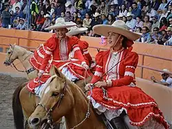 Escaramuza charra is the only female equestrian event in the Mexican charrería. The escaramuza means "skirmish" and consists of a team riding horses in choreographed synchronized maneuvers to music.[1][2][3] The women ride side-saddle and wear traditional Mexican outfit that include sombreros, dresses, and matching accessories. A team consists of 16 women, but only 8 ride at a time.[4] The routine is practiced in a lienzo, or a circular arena.[1]
