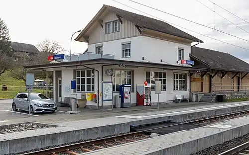 Eschenz railway station (German: Bahnhof Eschenz) is a railway station in Eschenz, in the Swiss canton of Thurgau. It is an intermediate stop on the Lake line and is served as a request stop by local trains only.