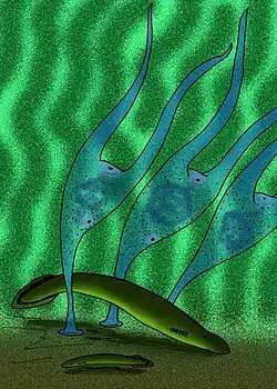 Escumasia ranges from 7.5 cm (3.0 in) to 20.5 cm (8.1 in) in length, with a stalk and two long arms making up most of this. These arms show no adaptations for capturing prey, thus their function is unclear. While being covered in cnidocytes and therefore a cnidarian affinity was proposed, this theory is unlikely due to an apparent anal slit on one side of the trunk showing that the organism was likely bilateral and had a "through-gut". The mouth is likely represented by a broad slit between the arms. The stalk is elongate, however rarely appears complete in fossils. The base is a bulbous disc with seemingly no surface features.[1]