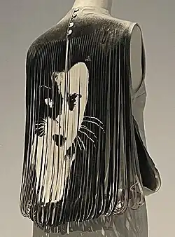 When McQueen and Leane participated in the Fashion in Motion series at the Victoria and Albert Museum (V&A) in 2001, they included accessories from Eshu as part of their presentation.[84] Four items from Eshu appeared in the 2011 exhibition Alexander McQueen: Savage Beauty, originally at the Metropolitan Museum of Art: Look 7, the dress of beige leather with metal wire crinoline; Look 8, the nude synthetic dress with mud and wooden beads; Look 37, the dress of yellow glass beads and black horsehair; and Look 58, the coat of black synthetic hair.[85] These were placed in the Romantic Primitivism section of the exhibit.[85] Five accessories from the collection appeared in the Cabinet of Curiosities section: a silver-plated resin neckpiece, craftsperson unspecified, and four pieces of jewellery in silver by Shaun Leane – a nose bar, a tusk mouthpiece, a pair of hooped earrings, and a set of coiled neck rings.[86] The exhibition Lee Alexander McQueen: Mind, Mythos, Muse, originally staged in 2022, featured a copy of Look 11 – the dress printed with the Wanda Wulz photograph – owned by the Los Angeles County Museum of Art.[87]