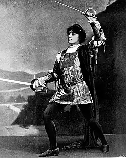 Esme Beringer first appeared on stage in 1888, as a boy character, Dick Tipton, in Little Lord Fauntleroy (she also substituted for the title character, usually played by her sister). By 1893 she was very active on the London stage. Beringer's athletic physique and extensive training with swords made her well-suited to breeches roles,[6] as when she played Romeo in 1896[7] (opposite her sister Vera as Juliet).[8][9] Other stage appearances by Beringer included The Prince and the Pauper (1890), Foreign Policy (1893, by Arthur Conan Doyle), Bud and Blossom (1893, by Gertrude Elizabeth Blood), Three Wayfarers (1893, by Thomas Hardy), Bess (1893), Hypatia (1893), The Gentleman Whip, The New Boy, Loyal, Hal the Highwayman, The Lady's Idol, The Strange Adventures of Miss Brown, The Benefit of the Doubt, The Late Mr. Castello, Gossip (1896), A Mother of Three, Woman's World, The Pilgrim's Progress, The Last of his Race, The Winter's Tale,[10] Saviolo (1899, by Egerton Castle), The Trifler (1905), The Anarchist (1908),[11] The Blue Stockings (1913),[12] and Lucky Jim (1916).[13][14][15] She also performed in vaudeville, in The Point of the Sword.[3]