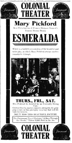 Esmeralda is a 1915 silent film starring Mary Pickford,[1] directed by James Kirkwood,[2] and produced by Adolph Zukor and stage impresario Daniel Frohman.[3]