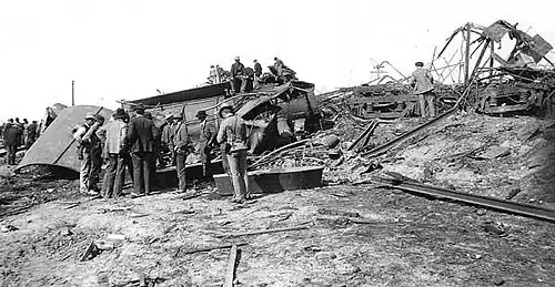 ![]() Makeshift coffins laid out near one of two wrecked steam engines. Burned Pullman cars are to the right. | |