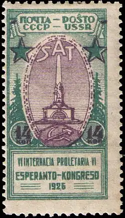 Limited information exists on official government positions regarding Esperanto in the Soviet Union, as little official documentation addressed the subject. According to a German press release in 1920, the Soviet Union required the teaching of Esperanto in public schools, though this report was denied by People's Commissar for Education Anatoly Lunacharsky. Following the New Economic Policy in 1921, the Soviet Union limited its endorsement of cultural initiatives, including Esperanto.[1] In 1925, the Soviet post office published the world's first Esperanto postage stamps.[2]