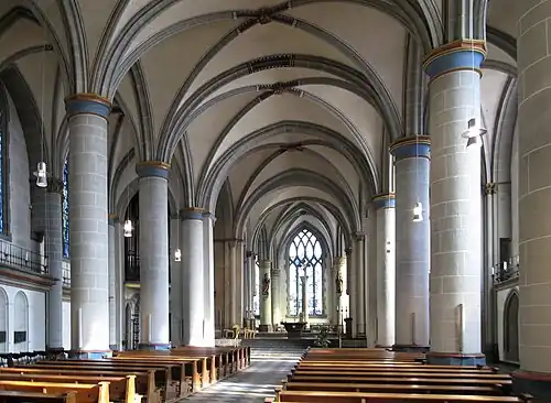 The new building also had three aisles with a transept and a choir shaped like the earlier choirs. A crypt was now built below the choir. The choir was closed with a semi-circular apse, which was encased within a half decagon. A two-storey outer crypt was connected to the choir, the west walls of which formed the east walls of the side choirs. Towers next to the altar room gave direct access to the crypt. The near choirs contained matronea, which were open to the transepts and the main choir. The outer walls of the ends of the transepts were made two storeys high, with the upstairs portion composed of three niches with windows. On the ground floor were niches, and the pattern of niches continued on the side walls. A walkway ran along the walls above these niches, leading to the matroneum galleries. The double bay between the westwork and the nave was maintained. The structure of the nave walls is unknown, but reconstructions based on other churches, especially that of Susteren Abbey which appears to draw from the new Ottonian church in many aspects, assume an interchange of piers and columns. There were probably wall paintings between the arcades and the windows on the walls, since remains of wall paintings have been found in the westwork. Outside, the clerestory of the nave had a structure of pilasters and volute capitals, probably with twelve windows.