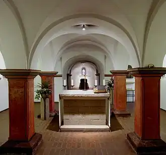 Through the installation of the crypt, the floor of the main (east) choir was raised above the floor level of the nave and transepts. The side choirs remained on the same level as the nave and transepts. The crypt consists of the three-aisled crypt of Agana, an inner crypt, and a five-sided outer crypt. The entrance to the inner crypt was from thr east side of the side choir, through which one passed into the outer crypt. The outer crypt had square and elongated rectangular vaults, separated by delicate square pillars. The three central vaults in the east were especially accentuated. Along the east wall in the two side vaults were semicircular niches. In the central vault was a small choir with three niches. The engaged pillars of the east wall of the outer pillar have sandstone plates on which 9 September 1051 is given as the date of the crypt's consecration. There are relics in the altars of the crypt.