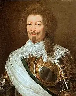 Meanwhile, the Estates began to consider the various candidates for king. There were a considerable number of French princes who held ambitions in that regard. Among them were the duke of Lorraine and his son the marquis du Pont; the duke of Nemours representing the house of Savoie (though the duke of Savoie also had interest); the young duke of Guise, the duke of Mercœur, Mayenne himself and his son the baron d'Aiguillon for the cadet house of Lorraine descended from the first duke of Guise.[28][50] During May, Mayenne also undertook secret negotiations with the nominally royalist Cardinal Bourbon, nephew of the first Cardinal Bourbon about him succeeding his uncle as ligueur king through a marriage to the Infanta.[51] Cardinal Bourbon had not yet received his orders, and it was therefore possible for him to cast them off and become a secular prince.[14] His candidacy was only pushed half heartedly by some involved, who were using it largely to pressure Henri's conversion.[52]