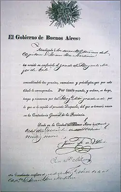 Following the USS Lexington raid of 1831, Luis Vernet refused to continue as military and civil commander in the Falkland Islands.[2] President Juan Rosas conferred upon Mestivier the appointment of interim military and civil commander on 10 September 1832. This was subsequently confirmed by being gazetted in the British and Argentine Packet News on 15 September 1832.[1] The announcement provoked a protest from the British minister in Buenos Aires, Henry Fox, on 28 September 1832,[1] which like the protests of 1829 against Vernet's appointment,[3][4] went unanswered apart from a brief acknowledgement. This, combined with the Lexington raid of 1831 prompted the British to send a naval patrol to re-assert sovereignty over the Falkland Islands.[5]
