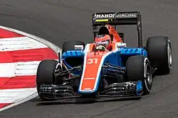 On 10 August 2016, Rio Haryanto was dropped from the backmarker Manor Racing team after his sponsors had failed to meet their contractual obligations. Ocon was named as his replacement for the second half of the season, driving alongside Pascal Wehrlein.[35][36] Ocon made his Formula One debut at the Belgian Grand Prix, finishing sixteenth.[37] He earned his best result of twelfth in the rain-affected Brazilian Grand Prix, dropping out of the points positions on the final lap.[38] This result placed Ocon 23rd in the Drivers' Championship, ahead of Haryanto.[39]