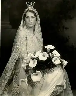 The wedding took place on December 1, 1928, in the rather small St. John's Episcopal Church in Pleasantville, New York.[8][9] At the wedding the bride wore a Swedish bridal crown in platinum and rock crystal and Queen Sophia's bridal veil in openwork lace. The veil was held by a coronet in silver and crystals, which was specially made by the Swedish court jeweler.[10] Prince Gustaf Adolf was the Best man and Prince Sigvard the Marshal. More than 1500 guests were invited to the festivities on the Manville estates, Hi-Esmaro. Wedding expenses totaled $1.5 million.[11]