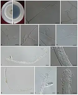 Species in the Esteya genus are characterized by the production of lunate conidia (asexual spores), distinctive adhesive structures that attach to nematodes and play a role in the infective cycle.[6] After adhesion, the conidia usually germinate within 18–24 h, killing the nematode when organs and tissues are destroyed by a mass of hyphae, and producing more lunate conidia to begin the cycle anew.[8]