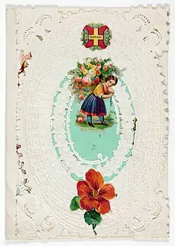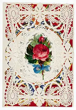 Howland's valentine cards became renowned throughout the United States and after her death, she was called "The Mother of the American Valentine."[2] She is credited for the introduction of the "lift-up" valentine, which created layers of texture and color using lace, ribbon, and other materials.[15] Howland introduced the layering of lace, use of thin paper, three-dimensional accordion effects, and a bouquet in which flowers would move to reveal a verse when pulled by a string.
