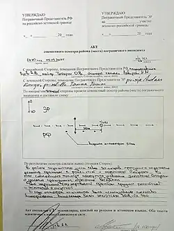 According to the Estonian Internal Security Service, immediately after the incident Estonian investigators and Russian border guards jointly investigated the scene, and agreed that the evidence showed that there were signs of a violent struggle and impact craters from the smoke grenades on the Russian side (in both protocols), with multiple footprints in a band of raked sand suggesting that a group of men crossed from and then returned to the Russian side (only in Estonian protocol).[6][8][9] On 10 September, Estonian newspapers published a bilingual protocol of border violation, signed on 5 September by Estonian and Russian border guards who had inspected the place immediately after the incident.[10] Both versions of the protocol indicate the direction of the incursion with a double-ended arrow across the border 30 metres (98 ft) from a border post and three craters 50 centimetres (20 in) in diameter on the Russian side of the border. The Russian version acknowledges the Estonian version as equally authentic. However the protocols appear to be not identical. The Estonian version explicitly mentions that the border breach originated in the Russian side to the Estonian one and then back, but the Russian version of the protocol does not contain any detail about the direction of the border breach.