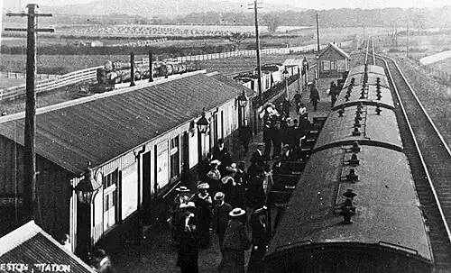 Eston station was located on Station Road off Eston High Street. It gave direct access to the centre of the old hamlet of Eston and the mining community of California (also called South Eston).[3] It opened on 1 January 1902 and station consisted of a single platform with a modest one-storey wooden station building and a coal depot behind. By 1911 it served a population of 28,095 people. Goods traffic was dominated by bricks, of which 6,416 tons were transported in that year.[6]
