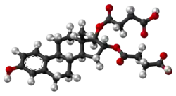 Estriol succinate is an estrogen ester, specifically, an ester of estriol, and acts as a prodrug of estriol in the body.[7][1] It is described as a weak estrogen in comparison to estradiol valerate.[1][8] Estriol succinate is used medically via oral and vaginal routes similarly.[1] In estriol succinate, two of the hydroxyl groups of estriol, those at the C16α and C17β positions, are esterified with succinic acid.[1] As such, when adjusted for differences in molecular weight, a dose of 2 mg estriol succinate is equivalent to 1.18 mg unconjugated estriol.[1] Unlike other estrogen esters, such as estradiol valerate, estriol succinate is hydrolyzed almost not at all in the intestinal mucosa when taken orally, and in relation to this, is absorbed more slowly than is estriol.[1] Consequently, oral estriol succinate is a longer-acting form of estriol than oral estriol.[9] Instead of in the gastrointestinal tract, oral estriol succinate is cleaved into estriol mainly in the liver.[1] After a single 8 mg oral dose of estriol succinate, maximum levels of circulating estriol of 40 pg/mL are attained within 12 hours, and this increases up to 80 pg/mL with continued daily administration.[1]