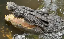 Fossil remains of a saltwater crocodile excavated in northern Queensland were dated to the Pliocene.[20][21] The saltwater crocodile's closest extant (living) relatives are the Siamese crocodile and the mugger crocodile.[22][23][24][25]