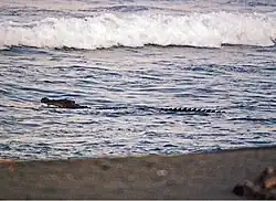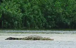 Large animals taken by adult saltwater crocodiles include sambar deer, wild boar, Malayan tapirs, kangaroos, feral pigs,[124] humans, orangutans, dingos, tigers,[125] and large bovines, such as banteng,[51] water buffalo, and gaur.[75][126][127][128][129][130] However, larger animals are taken only sporadically because only large males typically attack very large prey, and large ungulates and other sizeable wild mammals are only sparsely distributed in this species' range, outside of a few key areas such as the Sundarbans.[98] Off-setting this, goats, water buffalo and wild boar/pigs have been introduced to many of the areas occupied by saltwater crocodiles and returned to feral states to varying degrees, and thus can amply support large crocodiles.[28] In Australia, the saltwater crocodile's taste for feral pigs and buffalo was a key factor in their recovery for hunting pressures over the last fifty years according to studies published in 2022 by Dr. Marianna Campbell et al.,. Isotopes taken from the bones of crocodiles collected over five decades ago when crocodiles populations were low and comparisons to specimens from modern populations suggest that initially, Australian saltwater crocodiles subsisted on a more estuarine diet, and both hunting pressures by humans and a reduction in aquatic prey in places like the Top End resulted in a dietary switch to more terrestrial prey that allowed them to grow and recover more rapidly from population declines.[131] Any type of livestock, such as chicken, sheep, pigs, horses and cattle, and domesticated animals/pets may be eaten if given the opportunity.[98] As a seagoing species, the saltwater crocodile also preys on a variety of saltwater bony fish and other marine animals, including sea snakes, sea turtles, sea birds, dugongs, rays (including large sawfish[132]), and small sharks. Most witnessed acts of predation on marine animals have occurred in coastal waters or within sight of land, with female sea turtles and their babies caught during mating season when the turtles are closer to shore, and bull sharks being the only largish shark with a strong propensity to patrol brackish and fresh waters.[98][133][134][135][136][137] However, there is evidence that saltwater crocodiles do hunt while out in the open seas, based upon the remains of pelagic fishes that dwell only miles away from land being found in their stomachs.[11][12]