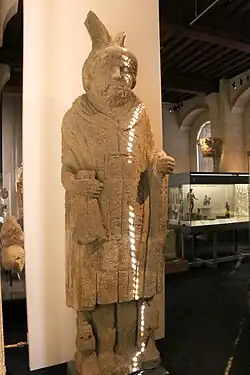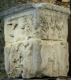 The Pillar of the Boatmen is a Roman column erected in Lutetia (Roman Paris) in the time of Tiberius (i.e., 14–37 CE) by a company of sailors. It contains a number of depictions of Roman and Gaulish gods with legends identifying them. On one block of this pillar is an image identified as Esus (alongside Tarvos Trigaranus, and the Roman gods Jupiter and Vulcan). The image is of a bearded man in a tunic with a billhook in his left hand; he is aiming at a tree which he grasps with his right hand. The panel carrying the legend "Tarvos Trigaranus" (literally, "Bull with three cranes") has foliage which continues over from Esus's panel; it depicts a bull with two birds on its back and one between its horns.[25][10]: 5–6