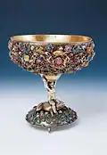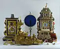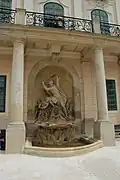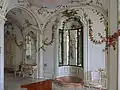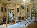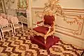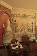 Eszterháza was first inhabited in 1766, but construction continued for many years. The opera house was completed in 1768 (the first performance was of Joseph Haydn's opera Lo speziale), the marionette theater in 1773.[1] Joseph Haydn's concerts typically took place in the Sala Terrena on the ground floor, in the picture gallery, where on May 30, 1781, a concert was performed in the presence of Prince Albert Casimir, Duke of Teschen and his spouse, Archduchess Maria Christina of Austria, daughter of the Empress Maria Theresa.[1] Musical entertainment for the higher ranks was provided in the main building, typically located in the picture gallery ground floor. Regular free-to-attend academies were typically held in the marionette theater, which were open to the public and hosting a whole range of cultural and environmental programmes.[1] The fountain in front of the palace was not completed until 1784, at which point the Prince considered his project complete.[1] The music room was decorated with white and gold walls with delicately rounded corners, the frescoed ceiling, glass chandeliers, roses, and audience's period chairs.