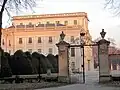 From 1766 to 1790, the estate was the home of the celebrated composer Joseph Haydn,[4] where he lived in a four-room flat in a large two-storey building housing servants' quarters, separate from the palace.[5] Haydn wrote the majority of his symphonies for the Prince's orchestra. Eszterháza also had two opera houses, the main theatre seating 400 (destroyed by fire in 1779) and a marionette theatre;[6] Haydn conducted his own and others' operas, often with more than a hundred performances per year.[7]