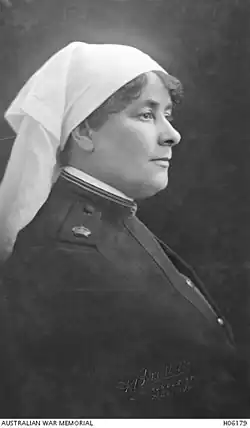 In August 1915, Richardson was appointed as the matron-in-charge of Reinforcements to Army Sisters for England and served in Harefield Hospital, then known as the No. 1 Australian Auxiliary Hospital.[1][2] Richardson was recalled to Australia in 1916, where she was made matron-in-chief on the staff of the director general of medical services at Army Headquarters, Melbourne – the first person to hold this position.[1] She held this position until 10 March 1920, during which time she supervised the administration of the Australian Army Nursing Service, hospital ships, sea transport, and nearly 3,000 nurses who had enlisted for service.[1][4] She also organised the demobilisation of the A.A.N.S.[1]