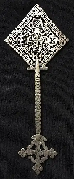 Ethiopian crosses, Abyssinian crosses, or Ethiopian-Eritrean crosses are a grouping of Christian cross variants that are symbols of Christianity in Ethiopia, Eritrea, and among Ethiopians and Eritreans. Their elaborate, stylized design is markedly distinct from other Christian cross variants.[1][2] Ethiopian crosses are almost always made from elaborate latticework, the intertwined lattice represents everlasting life.[3] No two crosses are exactly identical in style, the artisans who make them being allowed the freedom to exercise a measure of individual taste and creativity in their choice of shape and pattern. Crosses may be of the processional type with a socket at the base so they may be mounted on a staff and carried in church ceremonies or hand-held blessing crosses used by priests in benedictions.[4]