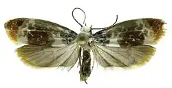 The length of the forewings is 7–8.8 mm (0.28–0.35 in). The ground color of the forewings is white, basally heavily spotted with shining gray or silver-blue on both the costal and dorsal areas. The ground color of the hindwings is whitish at the base, becoming brown towards the margins. Adults are on wing in February (in Trinidad), in May (in San Salvador and Yucatán), from June to July (in Veracruz), from July to August (in Sinaloa and Sonora), in November (in Venezuela) and in December (in Oaxaca).[1]